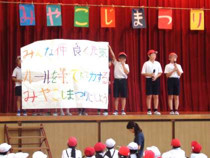 6月20日(金)、児童会が主催する「みやこじまつり」が開かれました。縦割り班の6年生が、1年生をお迎えに行き、講堂で全員が集まりました。