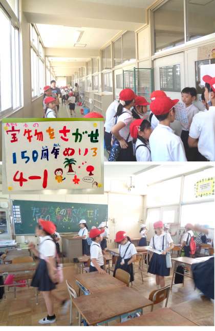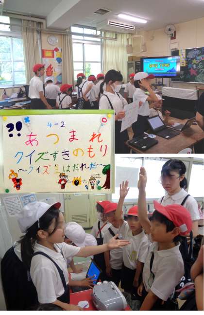 4年生のお店紹介です。1組は、教室にかくされた宝物を探す「いろいろなクイズに答える「宝物をさがせ!150周年めいろ」。2組は様々なクイズに答えていく「あつまれ クイズずきのもり」です。
