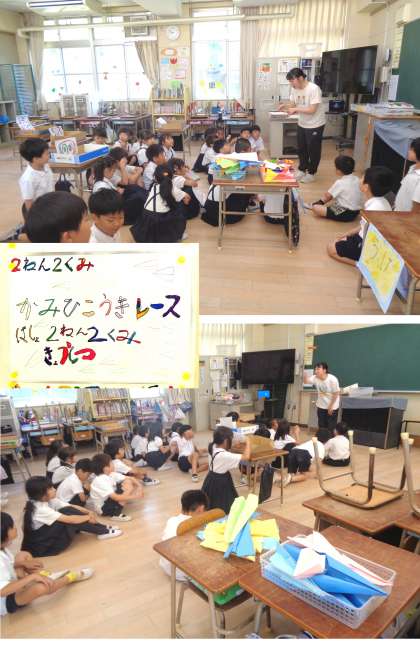 2組は、得点が書かれた箱に手作りの紙飛行機を飛ばして着陸させるゲームです。とても、よく飛ぶ飛行機があってびっくりしました。