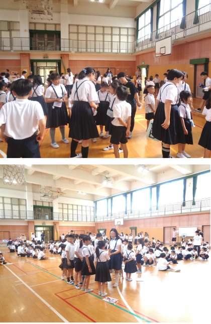 今日の児童集会は、ドッジボールの表彰の後、「ならびかえゲーム」を行いました。縦割り班の中で、指定されたミッション通りにお話しすることなく並ぶゲームです。