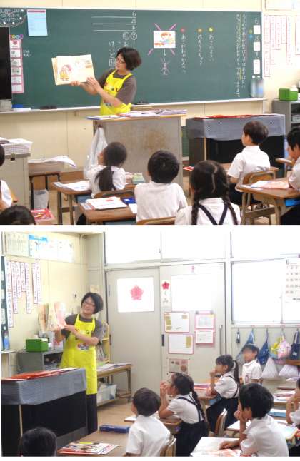 1年生の教室をのぞくと、1組では「おしりどろぼう」というカバのおしりをねらう動物たちの愉快なお話です。