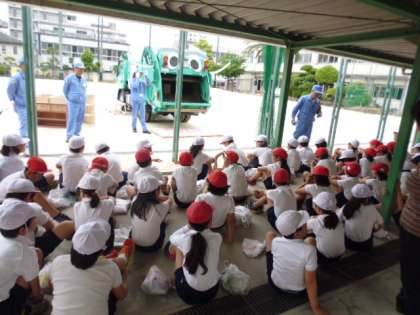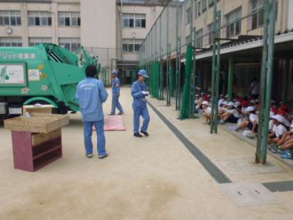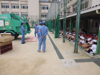 社会科の学習で環境事業局の方の協力によりパッカー車に来てもらって学習をしました。