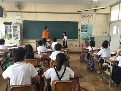 5年生はプールで水泳学習の予定でしたが、雨の予報で1組は教室で国語。