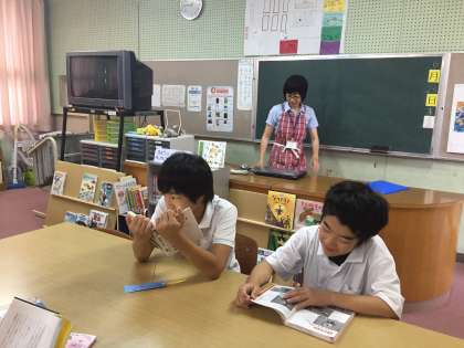 佐久間さんがアルゼンチンに行かれて、後任の方が配属されるまで、区図書館コーディネーターの新宮さんが代わりに来てくださっています。さっそく、6年3組が図書館で読み聞かせをしていただきました。