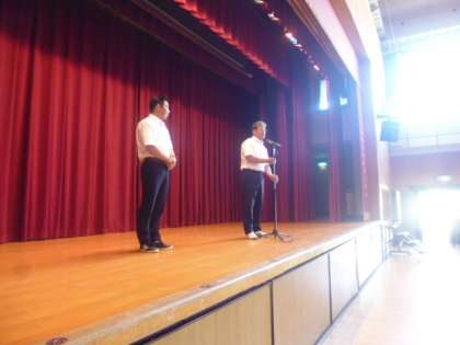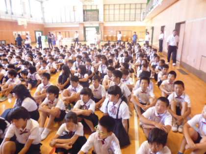 今日は、終業式です。子どもたちは女の子はリボン、男の子は蝶ネクタイをしてきました。終業式に先立って植山先生の着任式がありました。