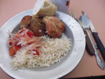 この日のメニューは鳥を焼いたものにごはん、ご飯を食べ終わると同じアルミの容器に