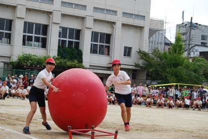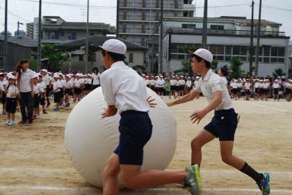全学年参加の大玉運び3年生までは転がし、4年生からは頭上を転がします。