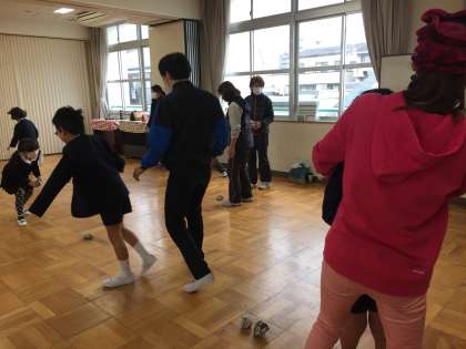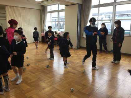 新聞紙を丸めた豆代わりの玉で鬼を退治しました。