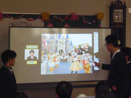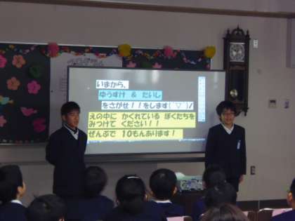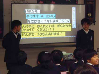 画面の中の自分を探せのクイズです。電子黒板をうまく利用していました。