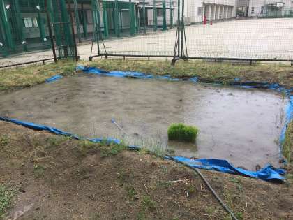1年生とタンポポさんの泥んこ遊びのあと5年生が田植えをします。
