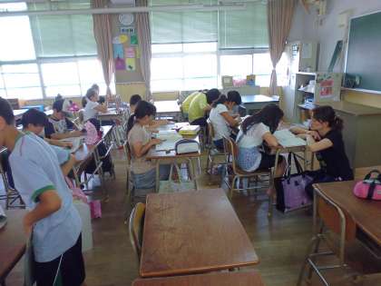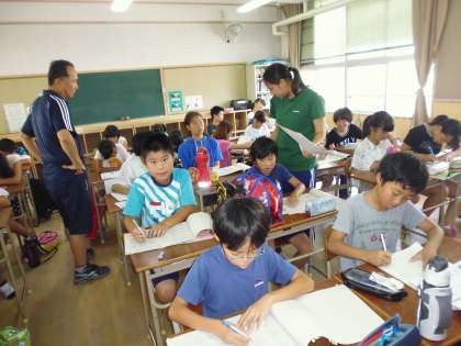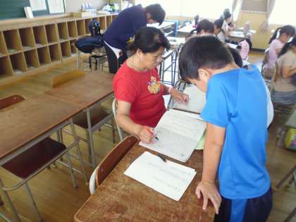 夏休みのプリントに○をつけてもらってニッコリ笑顔の都島っ子です。