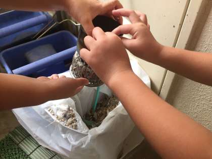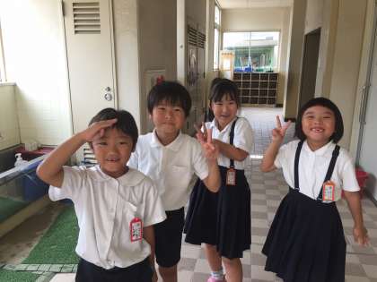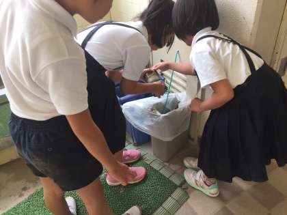 新館一階手洗い場に4人の子どもたちが悪戦苦闘をしています。