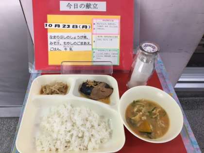 10月23日(月)の給食は、 ・なまりぶしのしょうが煮 ・みそ汁 ・もやしのごまあえ