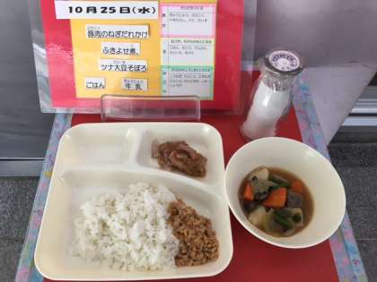 10月25日(水)の給食は、  ・豚肉のねぎダレかけ  ・ふきよせ煮  ・ツナ大豆そぼろ  ・米飯  ・牛乳
