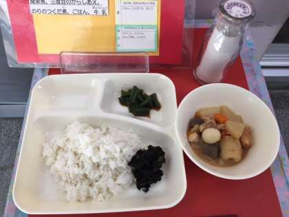 11月6日(月)の給食は、 ・関東煮(うずら卵除去) ・三度豆のからしあえ ・のりのつくだ煮 ・米飯 ・牛乳でした。