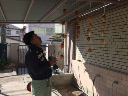 学校になった渋柿の皮をむいて管理作業員さんがつるし柿を作ってくださいました。