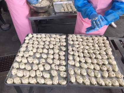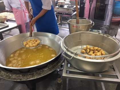作り方は、たこ、とうふ、小麦粉、でんぷん、かつおぶし(粉末)、青ねぎ、塩を加えて混ぜます。それを、ひとつひとつ調理員さんがまるめて、油であげていきます。
