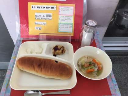 11月10日(金)の給食は、  ・たこボール  ・洋風煮  ・だいこんのピクルス  ・レーズンパン  ・牛乳です。