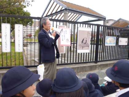 公園の中には毛馬町で生まれた蕪村の俳句の句碑がたくさんあり、子どもたちは熱心に聞いていました。
