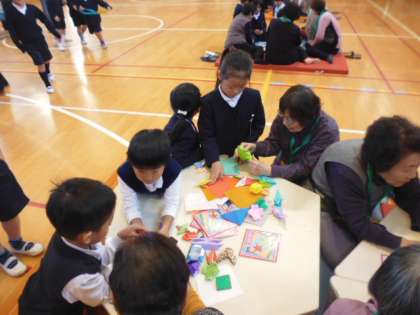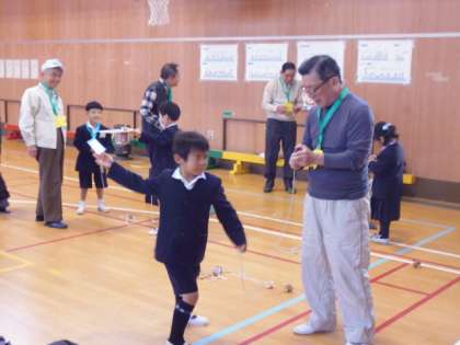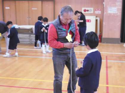 毎年行っていますが、地域の老人会の方から、1年生に昔の遊びを教えていただき、一緒に楽しくすごしました。子どもたちに優しく声をかけていただき、子どもたちはとても喜んでいました。ありがとうございました。