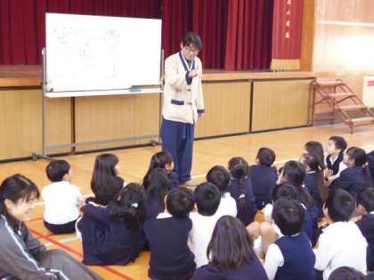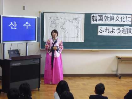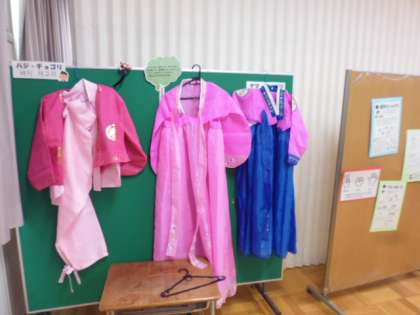 韓国朝鮮の文化に親しむ学習をこの時期に行っています。月曜日は講師のソンセンニムをお招きして言葉、遊び、楽器、歴史などについてお話をききました。多目的室では、民族衣装や本物の楽器のチャングやケンガリなどにふれる体験をしました。