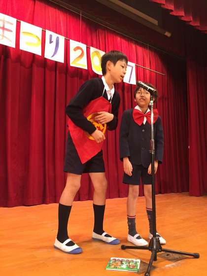 書評漫才に参加した5年生2コンビが児童集会でその作品を披露してくれました。