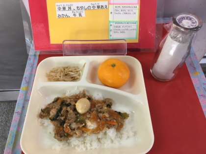 11月30日(木)の給食は、 ・中華丼 ・もやしの中華あえ ・みかん ・牛乳です。