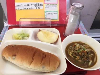 12月1日(金)の給食は、 ・カレーうどん ・はくさいの甘酢づけ ・りんご ・レーズンパン ・牛乳です。