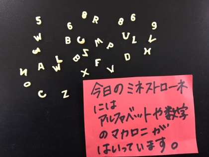 ミネストローネはトマト味のスープです。アルファベットや数字のマカロニを使用しています。