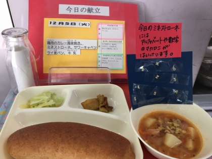 12月5日(火)の給食は、 ・鶏肉のカレー風味焼き ・ミネストローネ ・サワーキャベツ ・ライ麦パン ・牛乳です。