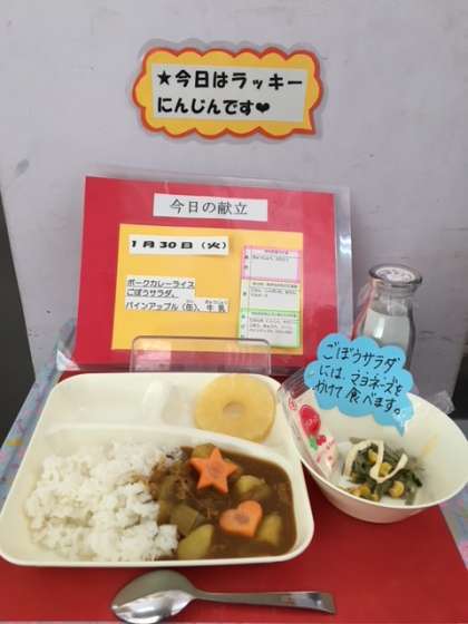 1月30日(火)の給食は、 ・ポークカレーライス ・ごぼうサラダ ・パインアップル(缶) ・牛乳です。