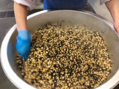 熱湯にひたした大豆を、でんぷんをまぶして油であげ、ひじきがはいった甘辛いタレで味付けをしています。鉄や食物繊維を多く含んでいます。