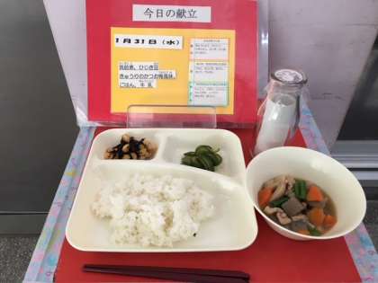 1月31日(水)の給食は、 ・筑前煮 ・ひじき豆 ・きゅうりのかつお梅風味 ・米飯 ・牛乳です。