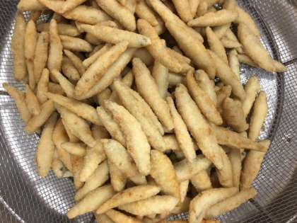 わかさぎは、ししゃもと同じキュウリウオ科の魚です。給食に出る「わかさぎフライ」は、新鮮なわかさぎをまるごとフライにしていて、魚にあるくさみや、苦みが少なくなっています。