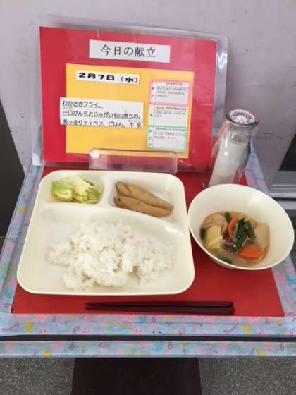 2月7日(水)の給食は、 ・わかさぎのフライ ・一口がんもとじゃがいもの煮もの ・あっさりキャベツ ・ごはん ・牛乳です。