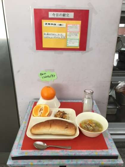 2月9日(金)の給食は、 ・押し麦のグラタン ・スープ ・いよかん ・レーズンパン ・牛乳です。