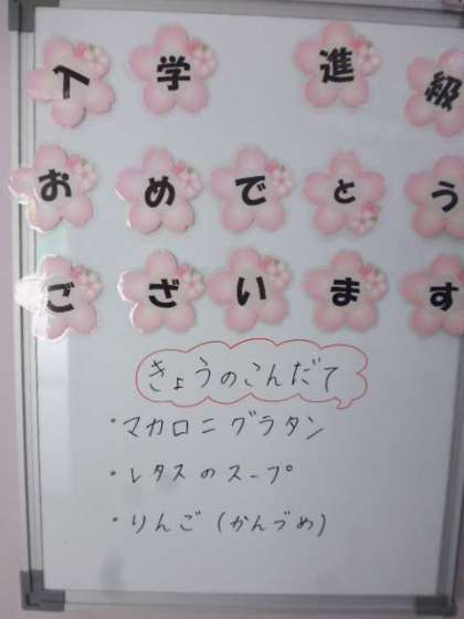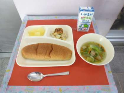今日の献立は、・マカロニグラタン ・レタスのスープ ・りんご(缶)です。