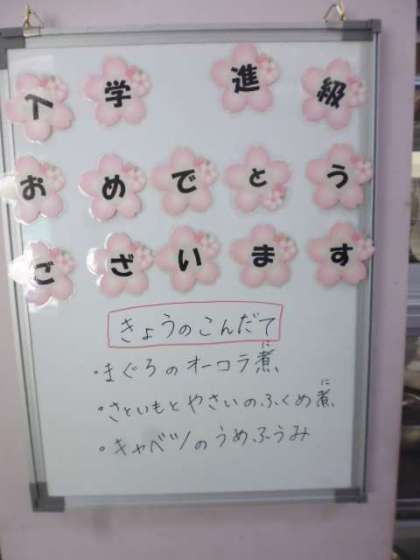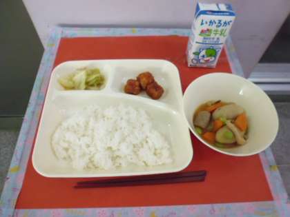 今日の献立は、  ・まぐろのオーロラ煮  ・さといもと野菜の含め煮  ・キャベツの梅風味です。