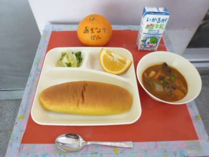 今日の献立は,・ビーフシチュー ・キャベツのピクルス ・甘夏かん ・パンプキンパン ・牛乳です。
