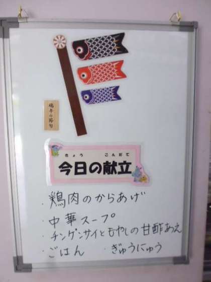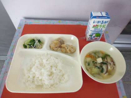 今日の献立は,・鶏肉のからあげ ・中華スープ ・チンゲンサイともやしの甘酢あえ ・ごはん ・牛乳です。