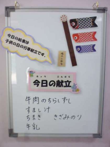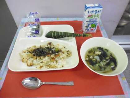 今日の献立は、・牛肉のちらしずし ・すまし汁 ・ちまき ・牛乳です。