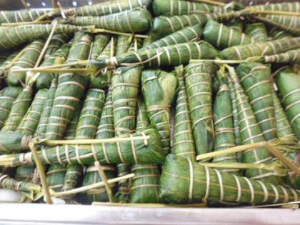 「ちまき」はもち米やうるち米、米の粉などで作ったもちを笹の葉でまいて、蒸して作ります。5月5日のこどもの日に「子供が元気で大きく育ちますように」という願いをこめて食べます。