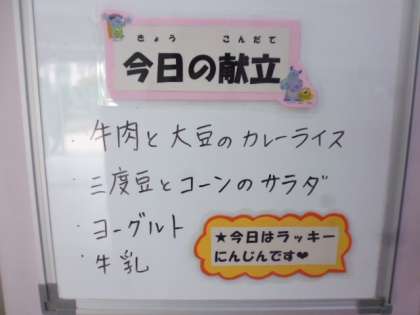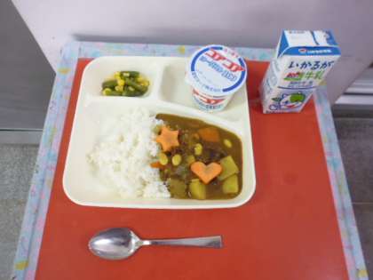 5月7日の給食は、  ・牛肉と大豆のカレーライス  ・三度豆とコーンのサラダ  ・ヨーグルト  ・牛乳です。