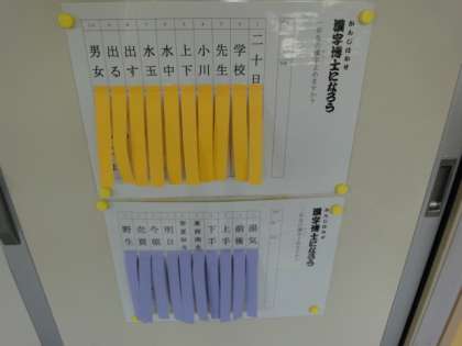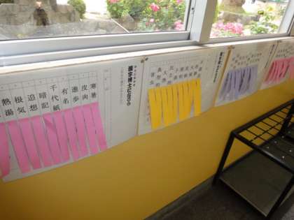 職員室の前に漢字のクイズを掲示しています。1年から6年生までに習う漢字を、学年ごとに張ってあります。児童は「こんなの読めるよ」と言いながら、積極的に声に出して挑戦しています。これからも、いろいろな漢字クイズを出しますので、挑戦してください。