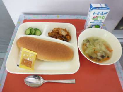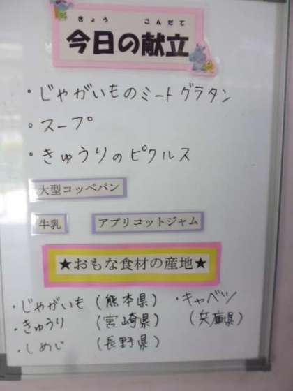 5月14日(月)の給食は、 ・じゃがいものミートグラタン ・スープ ・きゅうりのピクルス ・大型コッペパン ・アプリコットジャム ・牛乳です。