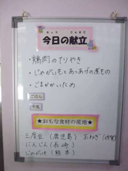 ★5月24日(木)の給食は、 ・鶏肉のてり焼き ・じゃがいもとあつあげの煮もの ・ごまかかいため ・ごはん ・牛乳です。