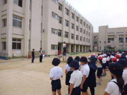 朝会では、都島区のキックベースボール大会において準優勝した女子児童たちが校長先生から表彰を受けました。