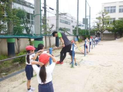 本日、1・2・3年生の児童を対象にアソビリティーからお越し頂いたスポーツインストラクターの山村さんに、鉄棒に関する指導を行ってもらいました。