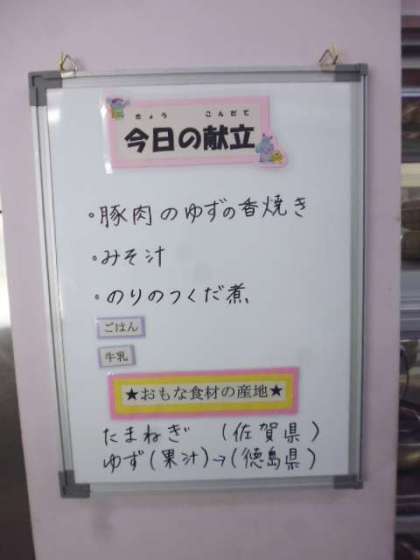 ★6月19日(火)の給食は、  ・豚肉のゆずの香焼き  ・みそ汁  ・のりのつくだ煮  ・ごはん  ・牛乳です。