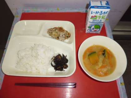 ★今日のみそ汁には、キャベツ・にんじん・かぼちゃがはいっていました。「かぼちゃ」は、夏が旬(たくさんとれる時期)の野菜です。